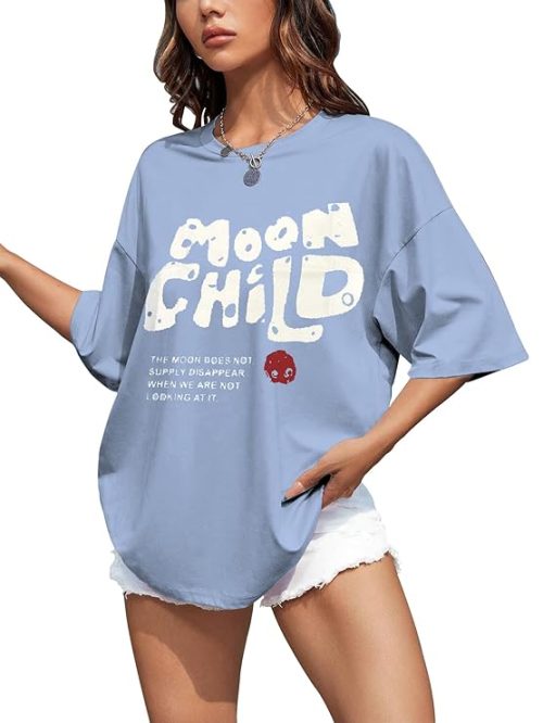 NATRIS Oversized Printed T-Shirt for Women | Stylish Loose Fit Cotton Tshirt | Casual Baggy Half Sleeve Graphic Tee | Trendy Printed Tshirt for Women (Moonchild, Blue, XXL)